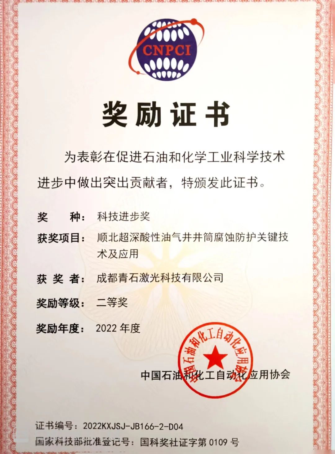 在中国石油和化工自动化应用协会审批颁发的科技进步奖中,成都青石激光的《顺北超深酸性油气井井筒腐蚀防护关键技术及应用》项目,获得了科技进步奖二等奖。