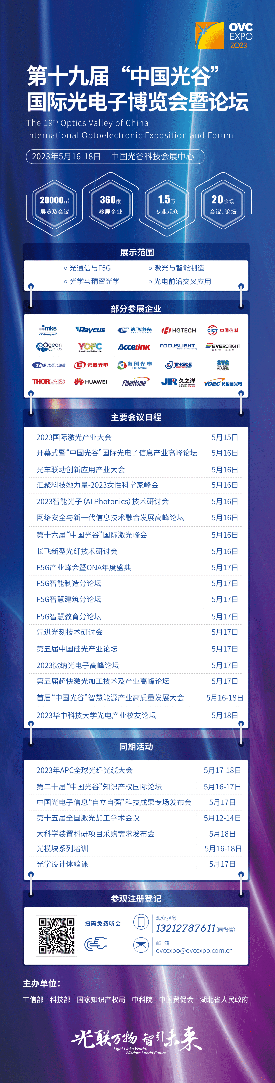 2023年5月16-18日,第十九届“中国光谷”国际光电子博览会暨论坛(以下简称“武汉光博会”)将于中国光谷科技会展中心举办。