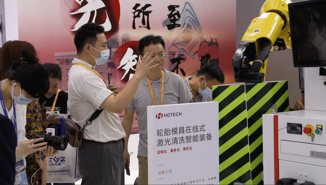 华工科技参展相关负责人告诉记者,轮胎的外形由橡胶在轮胎模具中硫化形成,模具反复使用易残留污染物,必须定期清洁。使用激光智能清洗装备,不用反复拆卸模具,还可预设路径自动执行清洗作业,大幅提升了洗模效率。未来激光清洗装备还将应用于有轨交通、石油、化工等行业,前景十分广阔。