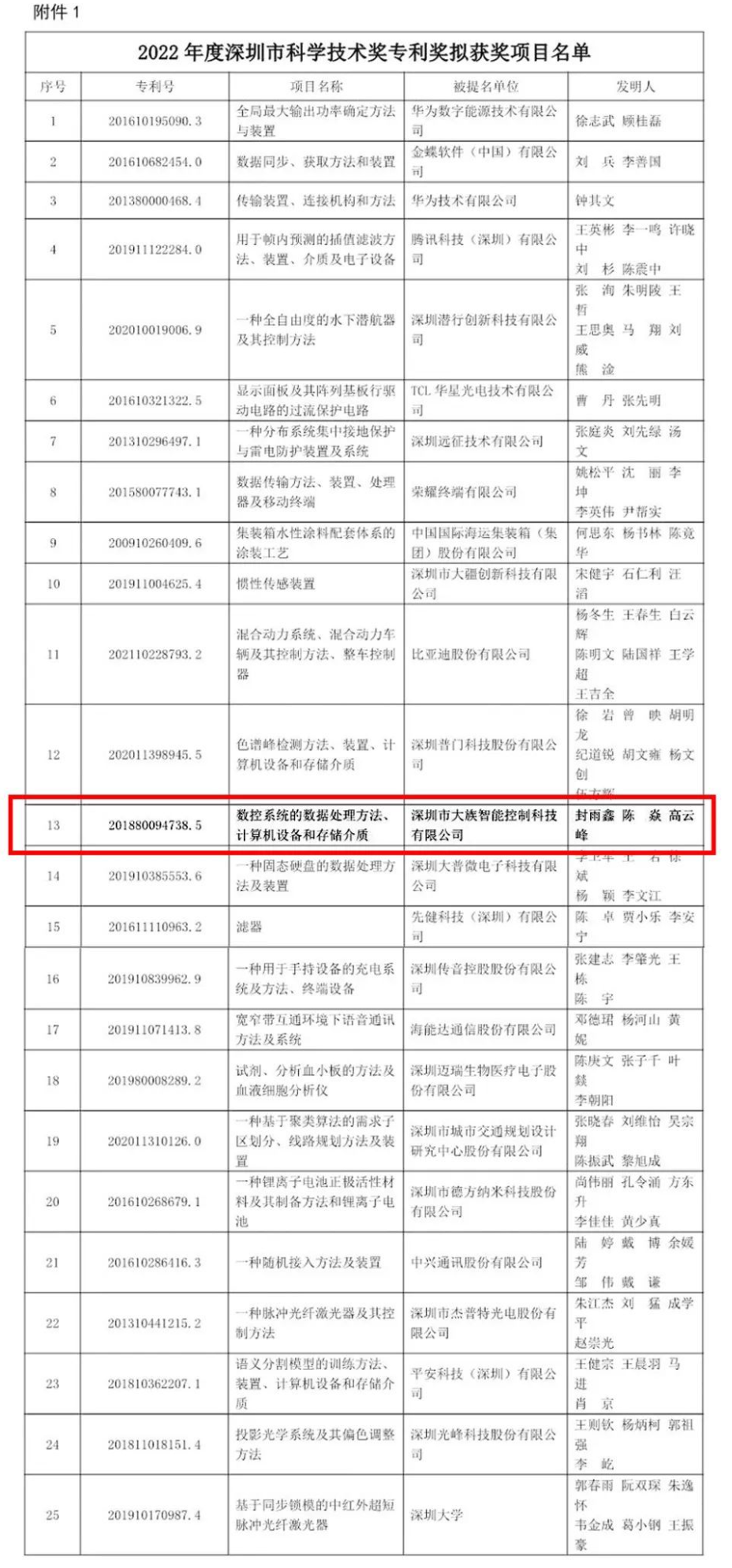 2022年企业核心专利之一“数控系统的数据处理方法、计算机设备和存储介质”因其技术的先进性、新颖性、创造性以及实用性等方面的突出优势,荣获2022年度深圳市科学技术奖专利奖。能在高新技术企业云集的深圳取得这项含金量十足的奖项,充分体现了公司在控制技术和数控系统领域的深厚积累和创新实力。