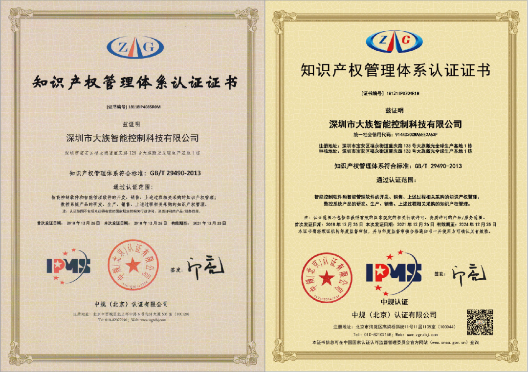 2018年大族智控正式通过知识产权管理体系审核后就建立起完善的知识产权管理体系,全面提升企业知识产权创造、运用、保护、管理水平,有力支撑企业高质量发展。以专利技术作为企业的重要无形资产,提升企业竞争力,为用户提供品质更为可靠,技术更具领先性的产品及服务。