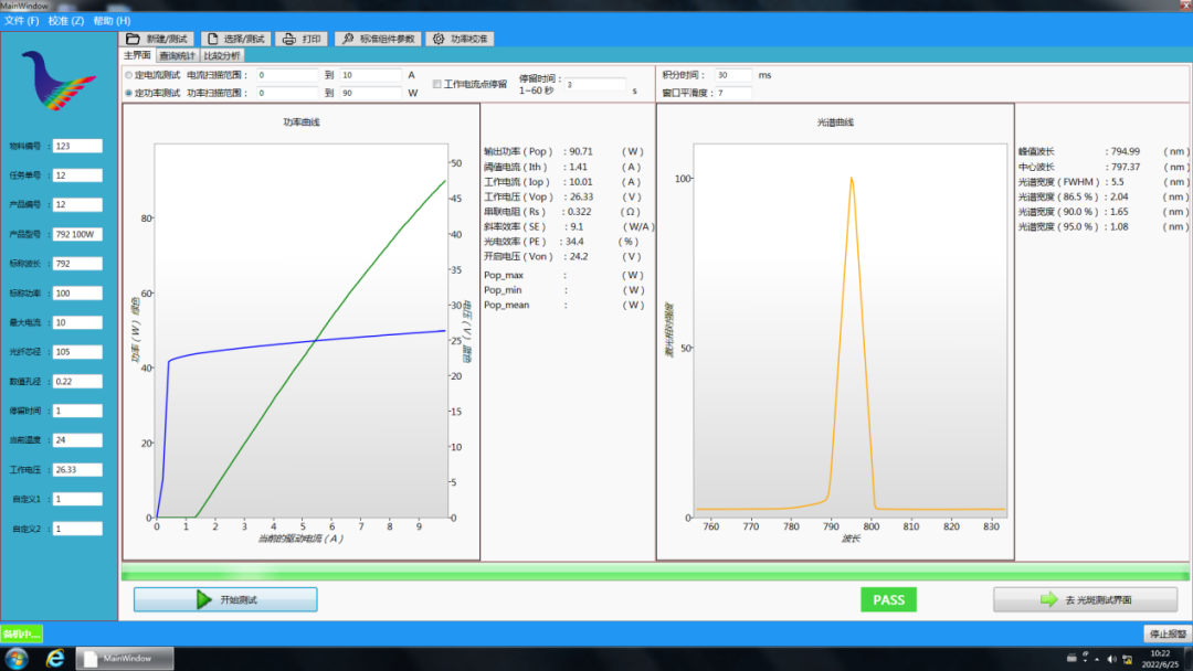 本设备集成了LIV(功率电流曲线和功率电压曲线)、光谱、NA占比及光斑发散角自动测试等功能;