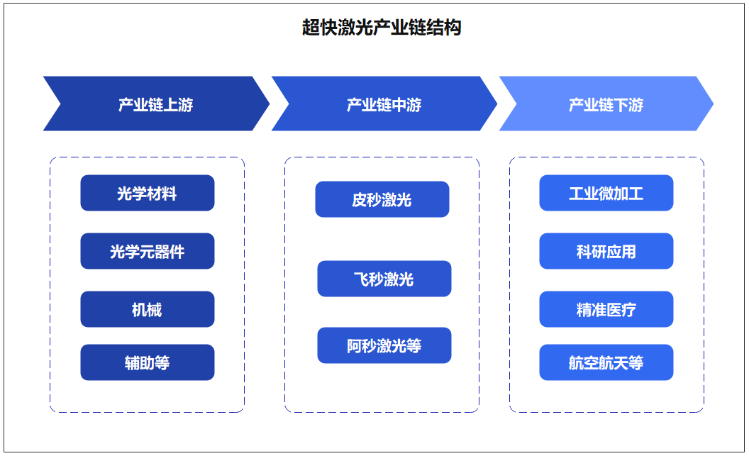 经过多年的发展,激光技术已经广泛应用于各行各业,中国 美国激光产业已初步形成完整的、成熟的产业链分布,超快激光作为激光产业的细分领域,上游主要包括激光材料和配套元器件,下游是工业微加工、科研应用、精准医疗、航空航天、以增材制造等领域为主,是连接超快激光产品消费市场的重要环节。
