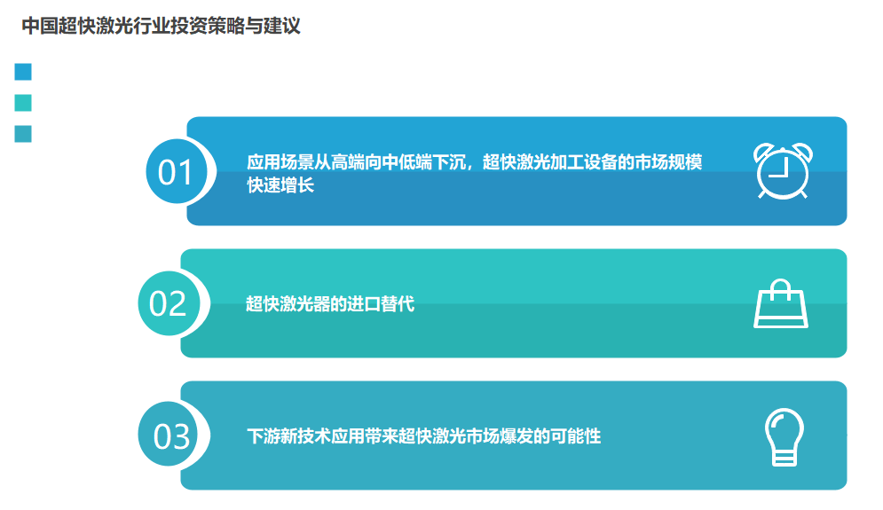 超快激光器的局域化过程与高功率激光器非常相似我们认为在未来随着超快激光应用的发展,有望复制高功率光纤激光器的进口替代。市场空间大、由于技术壁垒高,超快激光器很可能成为未来科技创新板的热点。建议从三个角度把握投资机会: