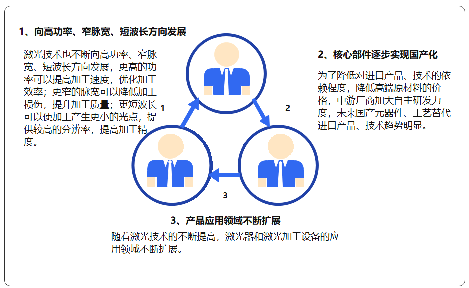 激光器是激光设备的核心器件。受核心器件的限制,我国中高功率激光器的国产化还有待提高。激光器的核心器件包括泵浦源、激光脉冲调制装置等由于泵源的原因、激光脉冲调制器件等核心器件技术难度大长期以来,我国激光器的核心器件都是进口的,制约了激光器的国产化进程。为了减轻进口产品的负担、对技术的依赖,降低高端原材料价格,加大中游厂商自主研发力度,未来做国产组件、技术替代进口产品、技术趋势明显。