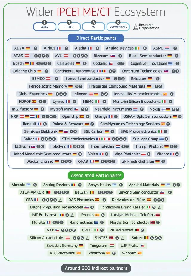 作为IPCEI的一部分,包括中小型企业和初创企业在内的56家公司将承担68个项目。欧洲约有600家间接合作伙伴将提供帮助,研发项目涵盖材料和工具、芯片设计、制造工艺等。