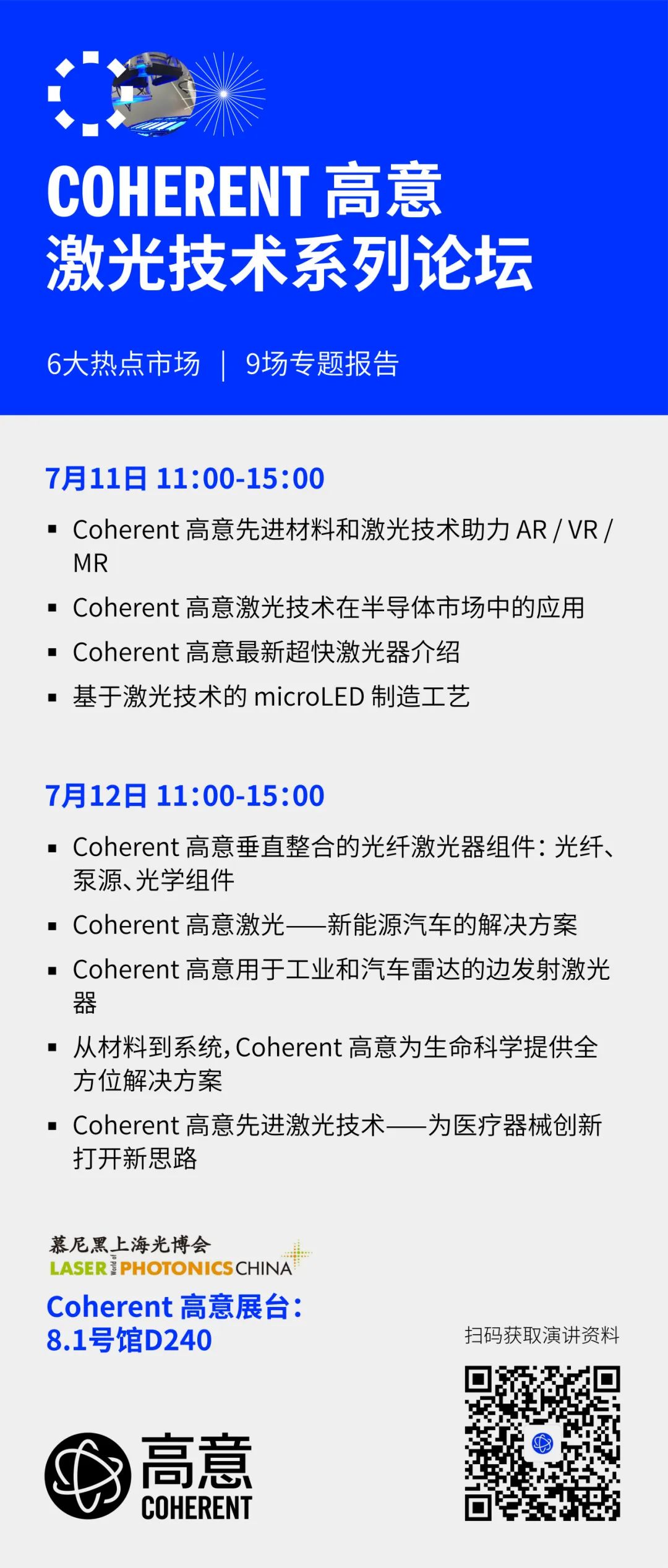 此次光博会期间,Coherent 高意将在展台举行一系列专题论坛,聚焦新能源汽车、3D传感和雷达、半导体制造、平板显示、医疗、生命科学等热点行业,共同探讨这些领域的最新趋势和技术创新。