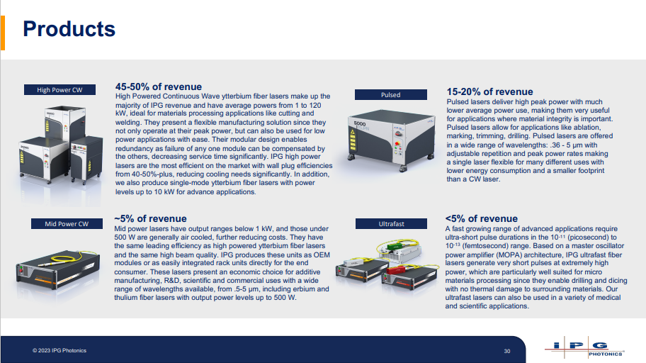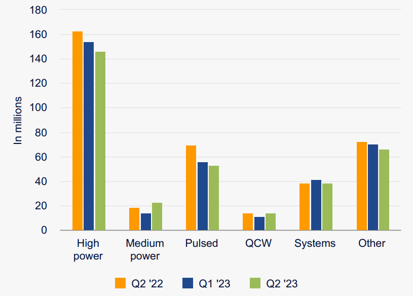 按产品种类划分,由于平板切割应用的需求下降,高功率连续波(CW)激光器的收入同比下降10%。由于清洁和太阳能电池制造应用的增长被箔切割和标记应用的需求下降所抵消,脉冲激光器的销售额与去年相比下降了24%。