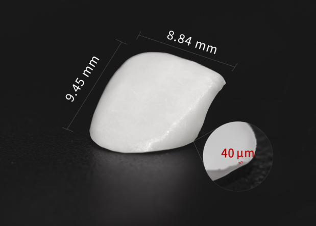 目前全球基于机加工的氧化锆牙齿贴面最低厚度在300μm以上。摩方精密与北大口腔医院的专家团队紧密合作,投资1200万元建立联合实验室,利用摩方超高精密3D打印技术,将氧化锆牙齿贴面厚度降至40μm左右,该技术不仅有助于在不磨牙或尽量少磨牙的前提下,快速强化和美化牙齿表面,保护天然的牙釉质,减少治疗过程中对健康牙体组织的损伤,使牙齿形状、颜色和整齐度快速焕然一新,而且能够迅速提升牙齿表面的耐磨性、防龋性,实现极微创/无创牙齿表面美学重建和快速强化,满足不同人群的美学要求。口腔生物材料和数字诊疗装备国家工程研究中心智能技术平台负责人、中华人民共和国科学技术部重点研发计划项目首席科学家、国家卫生健康委口腔数字医学重点实验室副主任、北京大学口腔医(学)院教授孙玉春表示:“极薄强韧3D打印氧化锆贴面技术可将陶瓷贴面的厚度从400微米降至最薄40微米,能快速、无痛地强化和保护牙齿表面,使其免受冷酸刺激和磨损,并且变得洁白而整齐,更为关键的是:与原有陶瓷贴面技术相比,整个过程的牙齿磨削量减少90%甚至无需磨牙。”