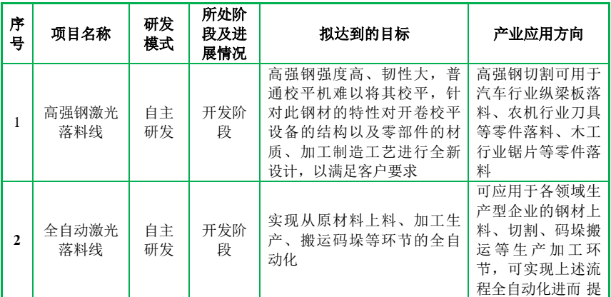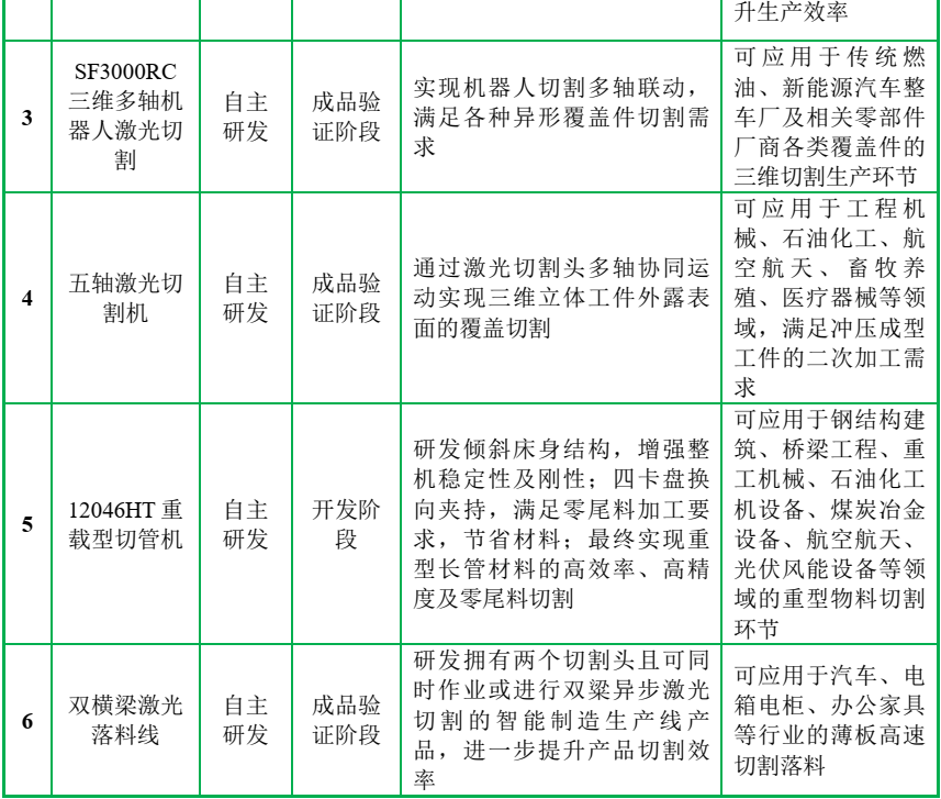 此外,公司拥有自主研发的核心零部件技术。截至报告期末,公司已成功研发出2KW、3KW单模光纤激光器技术;3-20KW等多模光纤激光器技术;2KW、6KW自动调焦光纤激光切割头技术;已完成平面切割数控工业软件的研发工作,进入产业化应用阶段。
