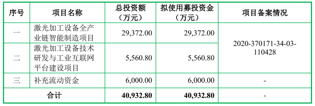据“激光之家”获悉,森峰激光此次IPO募资近4.10亿元主要用于激光加工设备全产业链智能制造项目、激光加工设备技术研发与工业互联网平台建设项目以及补充流动资金。