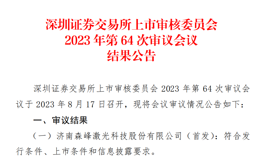 8月17日,深交所上市委宣布,济南森峰激光科技股份有限公司(简称“森峰激光”)首发上会,将登陆深交所创业板上市。