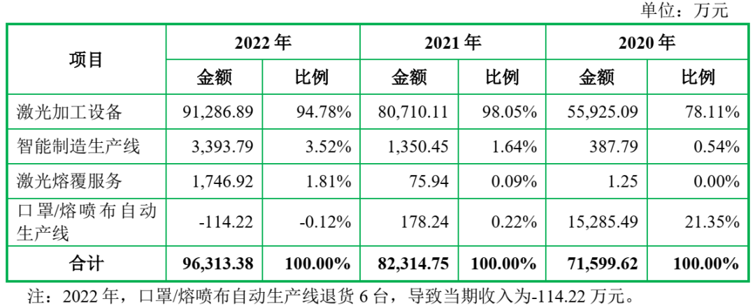 2022年,随着熔覆服务技术日益成熟完善,森峰激光以华东区域为中心,积极开拓全国市场,并实现销售收入1,746.92万元,相较2021年大幅增长,下游客户主要来自于煤炭、石油、化工等行业。2020年,面对市场对口罩等物资的大量需求,森峰激光依托多年来在激光加工设备行业积累的机械自动化相关工艺技术及研发、制造经验,在一个月内便实现了口罩自动生产线的研发、定型及量产。森峰激光相关产品凭借质量可靠、发货及时等优势获得了大量订单,2020年口罩/熔喷布自动生产线实现收入1.53亿元;随着市场需求的下滑,2021年及2022年该类产品收入相应大幅下降。