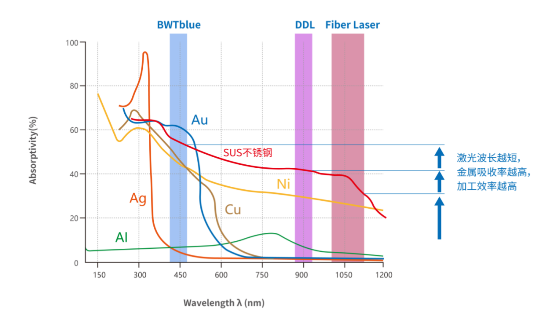 蓝光激光器主要应用于新能源行业,该行业的快速发展,对纯铜的焊接需求日益剧增。据了解,与标准光纤激光器的红外波长相比,铜在蓝色波长室温吸收率可达到45%(是其约5倍及以上),这一优势使蓝光激光器在动力电池领域颇具吸引力。比如,针对动力电池的铜制发卡电机乃至铝制外壳等部件,蓝光激光器可实现近乎完美的复合焊接。