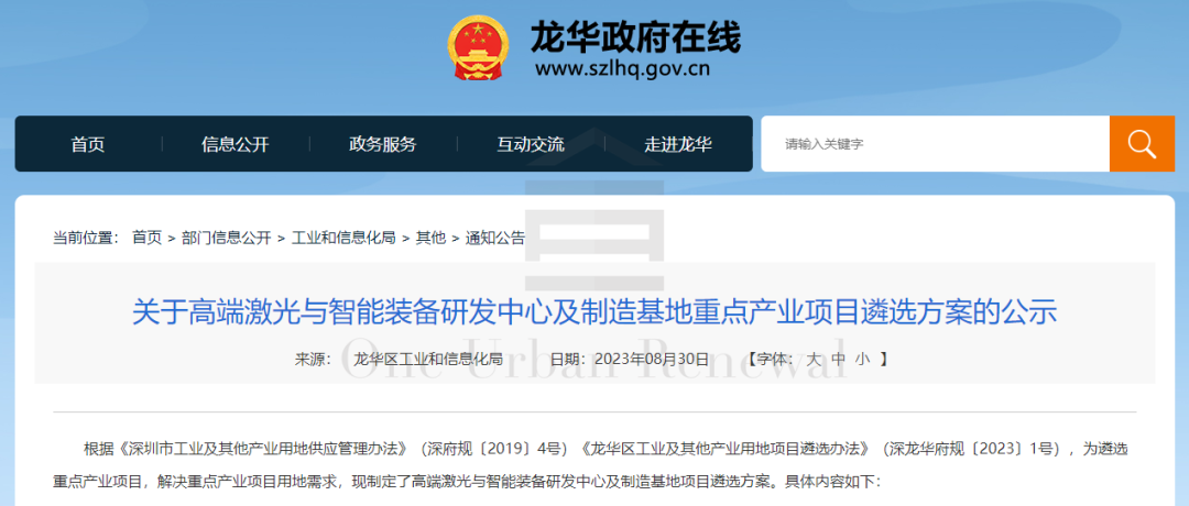 8月30日,深圳市龙华区工业和信息化局发布关于高端激光与智能装备研发中心及制造基地重点产业项目遴选方案的公示。