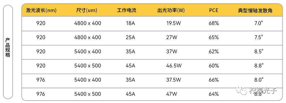 目前,柠檬光子EEL激光芯片系列产品有920nm、976nm波长可选,光功率覆盖18W、25W、35W、45W,可满足多场景应用需求。此外,产品系列均已通过头部客户的性能验证,步入量产阶段。