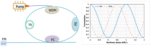 全光纤NALM激光器一般呈9字型结构,故也被称为9字腔激光器,其通过引入非线性相移和非对称分布的Sagnac环来实现锁模:如图1所示,光脉冲经过耦合器进入环行腔后,分为两个沿相反方向传输的脉冲,由于环内增益光纤位置的非对称性,导致两路光脉冲经历的非线性效应不同,两脉冲重新在耦合器处相遇并发生干涉时,各自积累的非线性相移不同,如图2所示,相位差在2π时两脉冲相干相长,相位差在π时两脉冲相干相消,Sagnac环展现出类似于可饱和吸收体的强光高透、弱光低透的光开光特性,可以实现锁模。