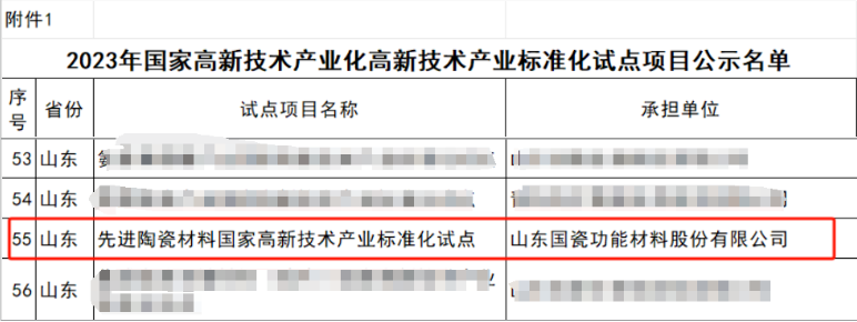 近日,国家标准化管理委员会公示了2023年度国家高新技术产业标准化试点示范项目名单,山东国瓷功能材料股份有限公司申报的“先进陶瓷材料国家高新技术产业标准化试点”成功入选。