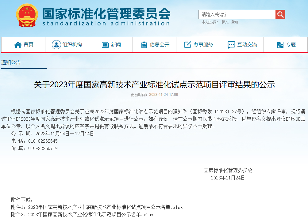 近日,国家标准化管理委员会公示了2023年度国家高新技术产业标准化试点示范项目名单,山东国瓷功能材料股份有限公司申报的“先进陶瓷材料国家高新技术产业标准化试点”成功入选。