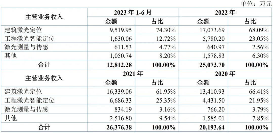 据招股书,莱赛激光是激光测量与智能定位应用领域整体解决方案提供商,专注于激光测量与智能定位领域产品的研发、生产和销售。经过二十多年的深耕,公司已发展成激光发射、激光接收、激光测距、距离传感与控制、水平度和角度传感与控制等产品制造商。