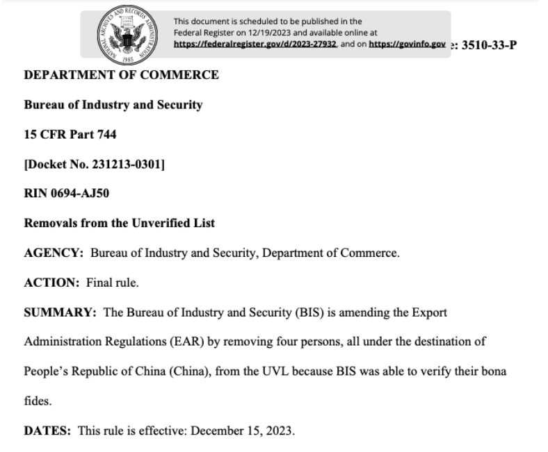 据美国政府在《联邦公报》(Federal Register)上发布的信息,一份由美国商务部工业与安全局(Bureau of Industry and Security)拟于12月19日发布的文件显示,工业与安全局修订美国《出口管理条例》(EAR),将4家中国公司移出“未经验证清单”(UVL)。
