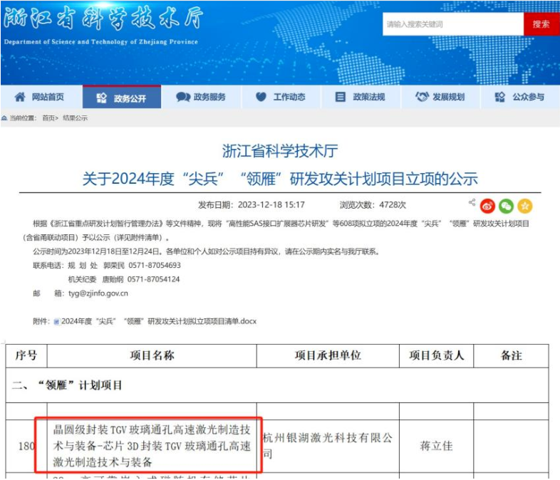 近日,浙江省科学技术厅公示了2024年度“尖兵”“领雁”研发攻关计划拟立项项目清单。由杭州光学精密机械研究所(以下简称“杭州光机所”)孵化企业——杭州银湖激光科技有限公司主导研发的项目“晶圆级封装TGV玻璃通孔高速激光制造技术与装备-芯片3D封装TGV玻璃通孔高速激光制造技术与装备”成功入选!