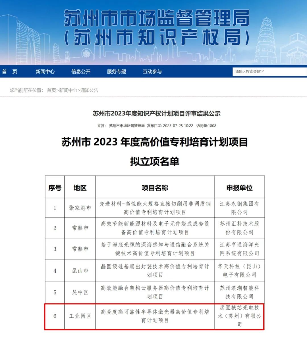 近日,苏州市市场监督管理局公布了2023年苏州市知识产权计划项目评审结果,度亘核芯的“高亮度高可靠性半导体激光器高价值专利培育计划项目”获批苏州市高价值专利培育计划项目。