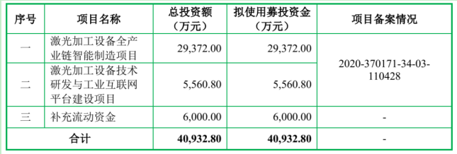 据“激光之家”获悉,森峰激光此次IPO募资近4.10亿元主要用于激光加工设备全产业链智能制造项目、激光加工设备技术研发与工业互联网平台建设项目以及补充流动资金。