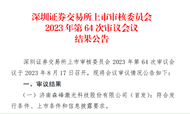 8月17日,深交所上市委宣布,济南森峰激光科技股份有限公司(简称“森峰激光”)首发上会,将登陆深交所创业板上市。