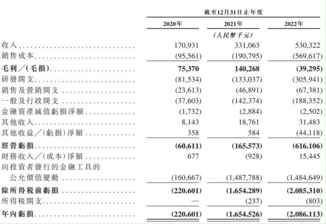 财务方面,于2020年、2021年以及2022年,速腾聚创实现收入分别约为1.71亿元、3.31亿元以及5.30亿元人民币;公司近三年持续亏损,年内亏损分别约为-2.21亿元、-16.55亿元以及-20.86亿元人民币。