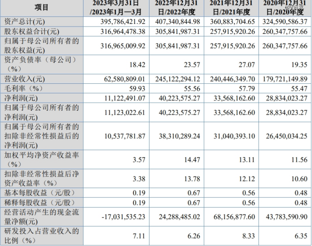 根据招股书,2020年、2021年、2022年及2023上半年,奇致激光实现营业收入分别约为1.8亿元、2.4亿元、2.5亿元和6260万元;归属于母公司所有者的净利润分别为2883.4万元、3356.8万元、4022.3万元和1112.3万元,毛利率达到55.5%、57.8%、55.6%和59.9%,处于较高水准。