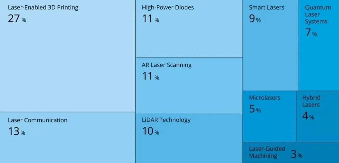 此外,激光雷达可实现遥感并利用激光测量距离,为汽车和增材制造等行业绘制高分辨率三维地图。激光行业的其他主要趋势包括3D打印、智能激光系统和AR激光扫描。此外,激光制导机器和材料科学的进步提高了各行各业的效率。