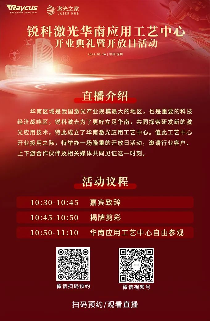 而为了让华南区域新能源、汽车制造等领域的行业客户最大程度地了解锐科华南激光应用工艺中心,并携手共同探索研发新的激光应用技术。值此工艺中心开业投用之际,锐科激光隆重举办华南激光应用工艺中心开业典礼暨开放日活动,诚挚邀请产业链上下游行业客户、合作伙伴及相关媒体共同见证这一重要时刻。2024年1月16日10:30观看直播,我们一起拭目以待!