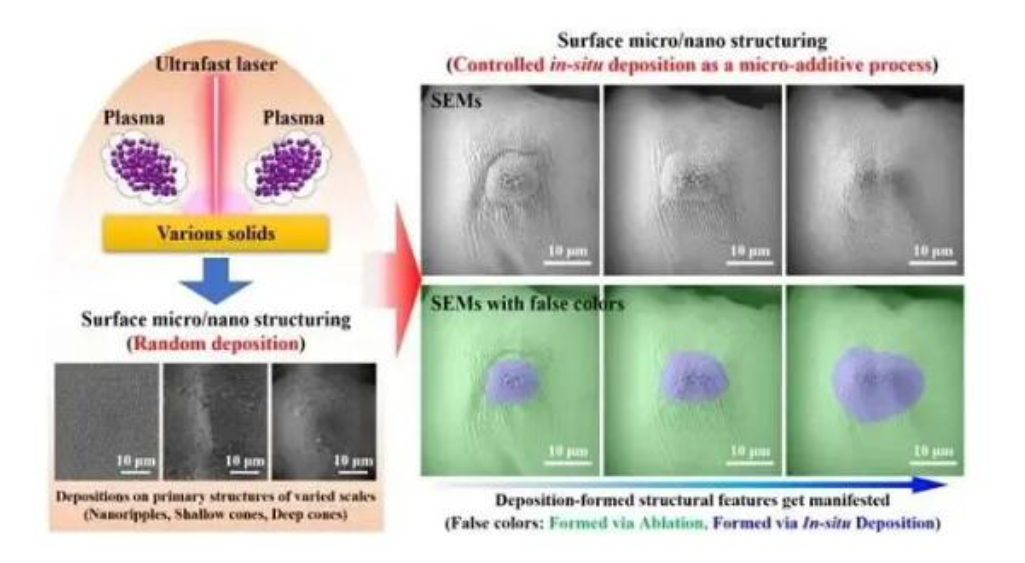 清华大学持续关注超快激光技术在结构制造中的应用,致力于更好地控制结构制造并开发更灵活的制造方法。研究人员不仅探索了超快激光烧蚀过程的控制,还在最近的研究中证明了原位超快激光烧蚀固体表面后的颗粒沉积的可控性,并成功将其应用于局部微增材工艺,堆积分层表面结构。