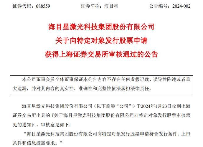 1月23日晚间,海目星激光科技集团股份有限公司(简称“海目星”,688559.SH)发布关于向特定对象发行股票申请获得上海证券交易所审核通过的公告。海目星于2024年1月23日收到上海证券交易所出具的《关于海目星激光科技集团股份有限公司向特定对象发行股票审核意见的通知》。审核意见如下:“海目星激光科技集团股份有限公司向特定对象发行股票申请符合发行条件、上市条件和信息披露要求。”