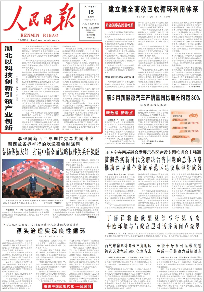 6月15日,人民日报头版头条以《湖北以科技创新引领产业创新》为题,关注湖北坚持向科技创新要增长、以动力变革提质效,不断塑造发展新动能新优势,其中多处报道光谷企业、研发机构的创新实践。以下为全文转载。
