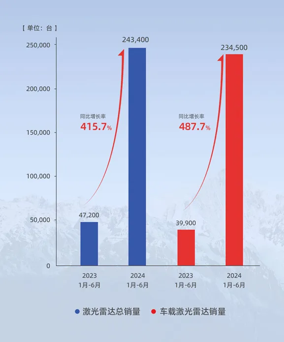 7月10日,港股“激光雷达第一股”速腾聚创公布2024年上半年业务进展。数据显示,2024年1—6月,速腾聚创激光雷达销量约为24.34万台,同比增长415.7%,其中车载激光雷达销量约为23.45万台,同比增长487.7%。2024年第二季度,速腾聚创激光雷达销量约为12.3万台,车载激光雷达销量约为11.83万台。