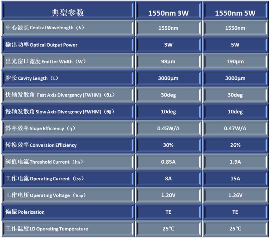 虽然在研发过程中面临了诸多挑战,但凭借团队的专业素养和不懈努力,近日,正式发布首款1550nm—3W/5W半导体激光芯片产品。该产品相比于市场同类产品具有较高的电光特性,在峰值功率、工作电流、工作电压等电性能参数指标上取得了全面提升,并在长期可靠性和高温特性上也取得了重大突破。