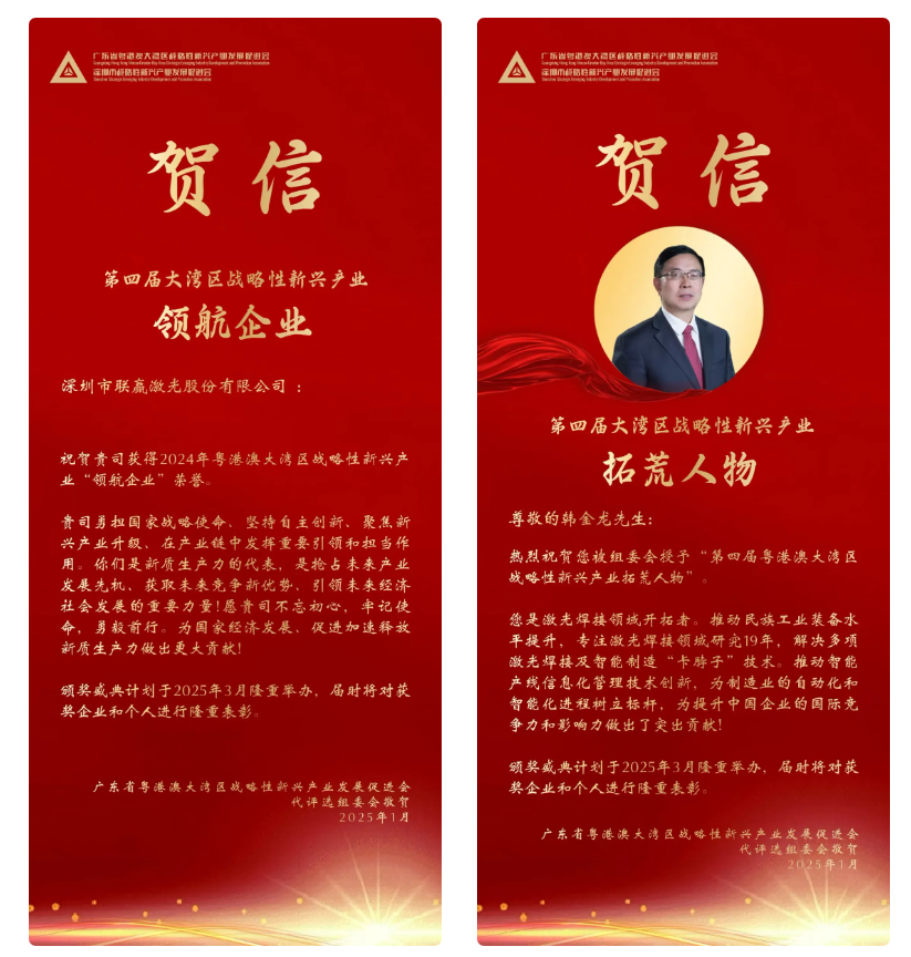 近日,2024年大湾区战略性新兴产业领航企业暨第四届大湾区战略性新兴产业“拓荒人物”、“青年领袖”评选结果揭晓。深圳市联赢激光股份有限公司成功入选“领航企业”榜单,联赢激光创始人、公司董事长韩金龙先生获评“拓荒人物”荣誉称号。