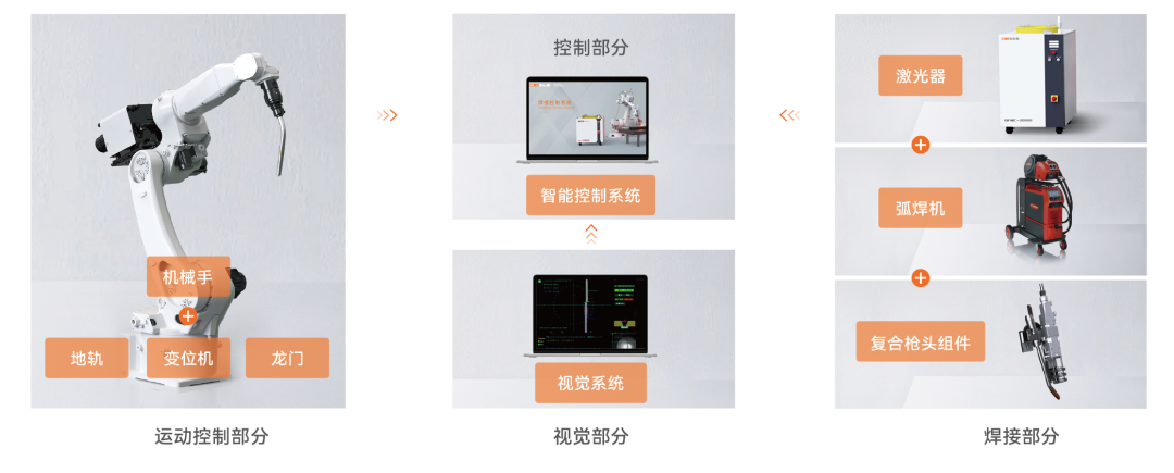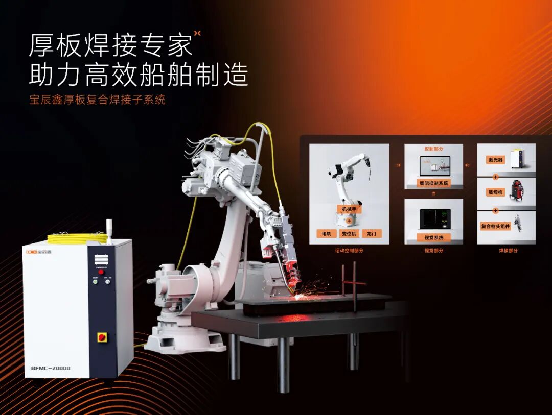 创鑫激光子公司宝辰鑫基于激光-电弧复合焊技术推出了船舶复合焊接子系统的标准化预集成方案,方案搭载高功率连续光纤激光器、定制化复合枪头组件及高度集成的智能控制系统;激光焊接头与电弧焊接头通过复合枪头结构,以双热源的方式搭载在机械手或其他运动控制平台上,并搭配视觉系统,实现高稳定、高质量的焊接,可应用于不锈钢、碳钢、铝合金等厚板材料的拼接焊或角焊等工艺。