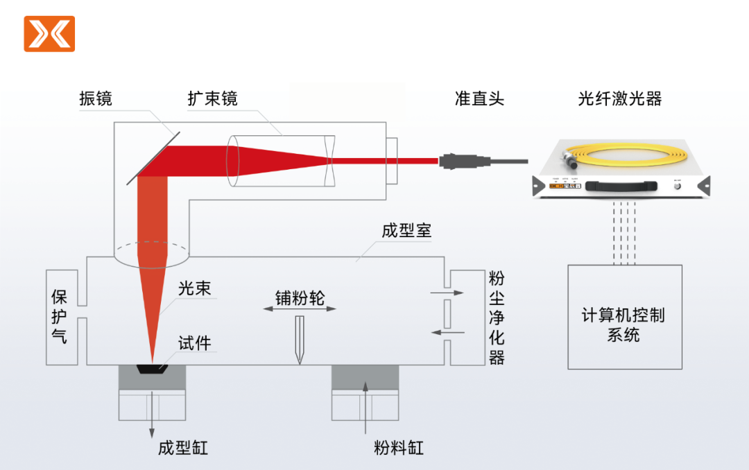 (常规的3D打印光路图,激光通过准直、扩束镜、振镜、场镜等聚焦在工作面)