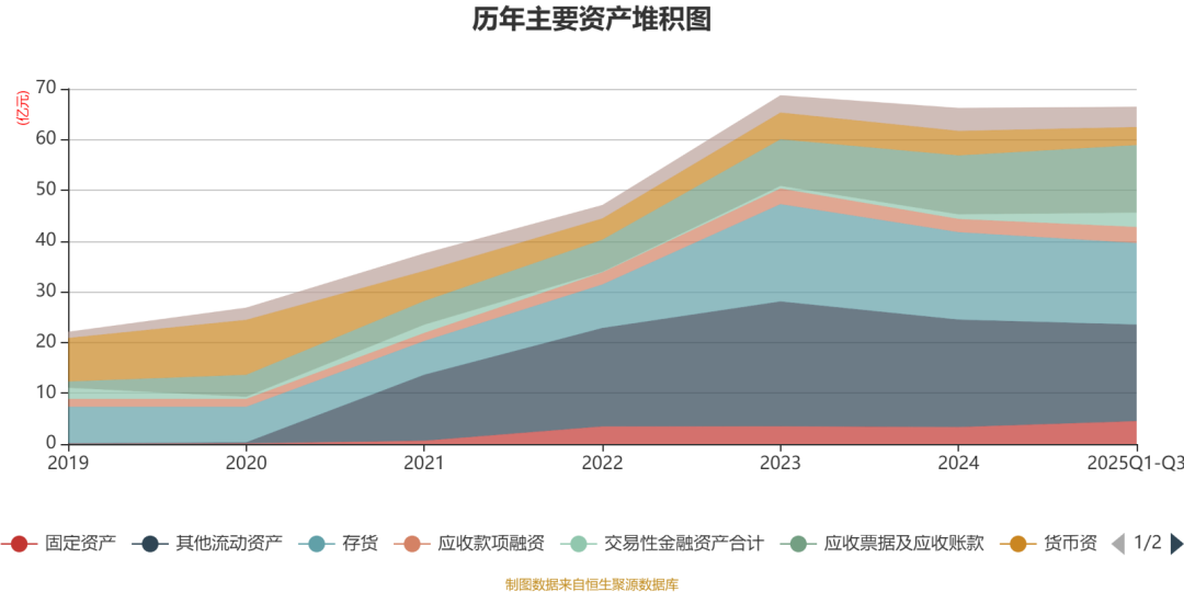 资产重大变化方面,截至2025年三季度末,公司其他流动资产较上年末减少10.14%,占公司总资产比重下降3.34个百分点;交易性金融资产合计较上年末增加211.23%,占公司总资产比重上升2.86个百分点;应收票据及应收账款较上年末增加14.91%,占公司总资产比重上升2.54个百分点;在建工程合计较上年末减少99.12%,占公司总资产比重下降2.08个百分点。