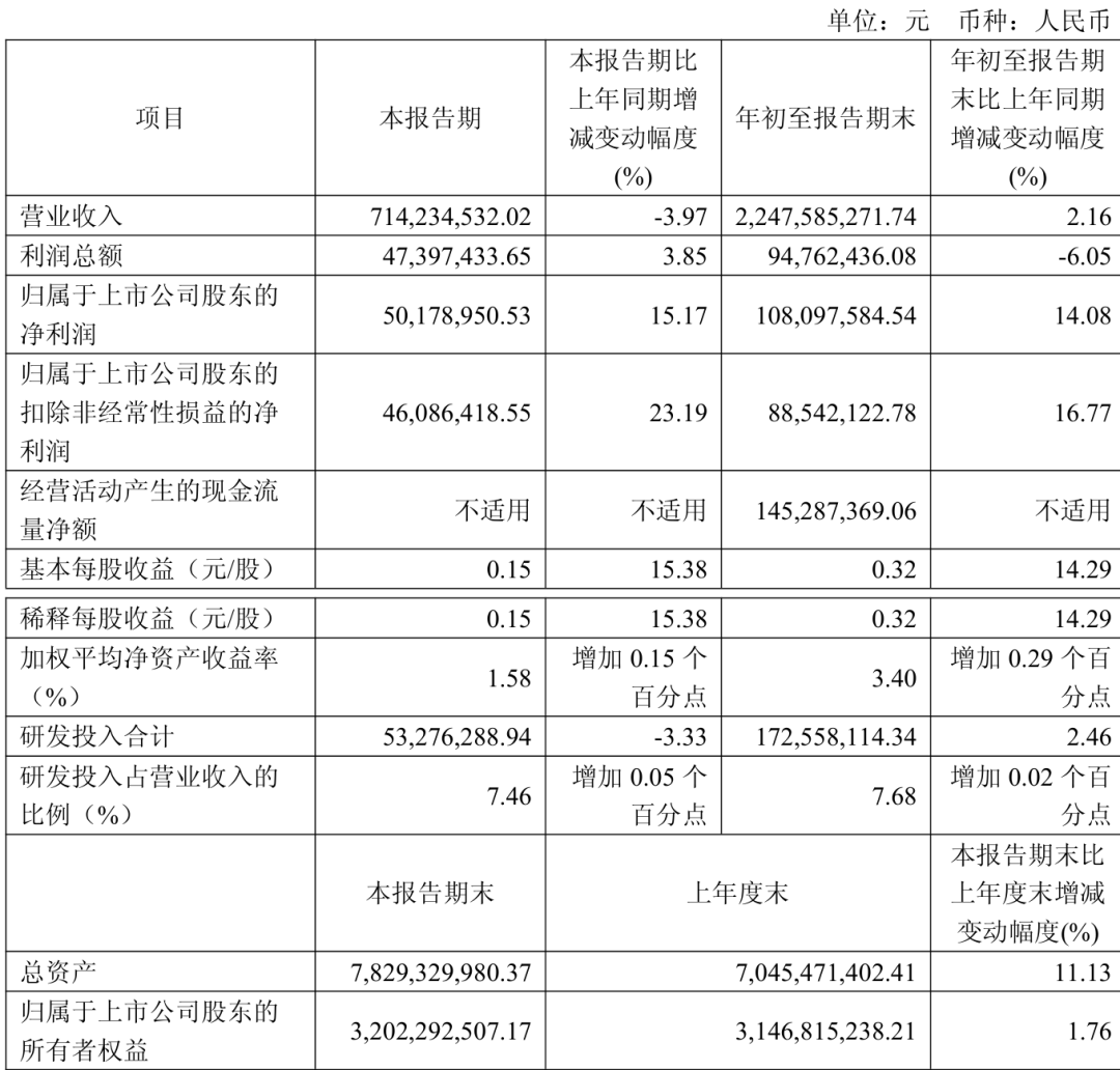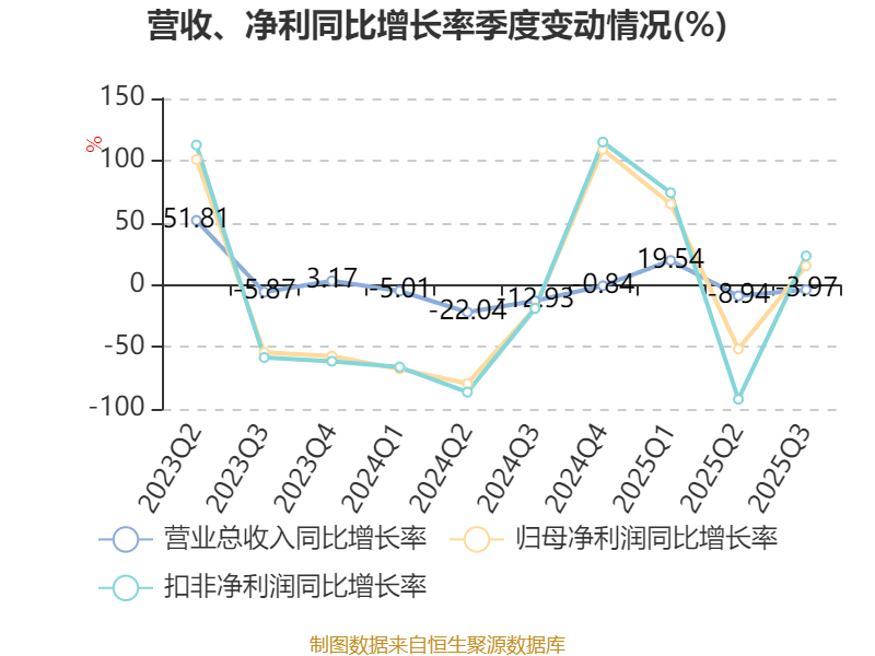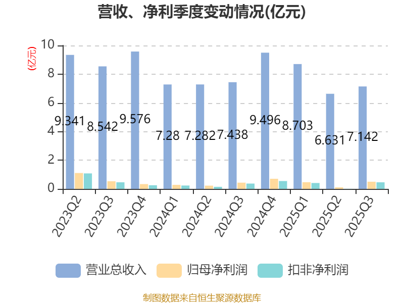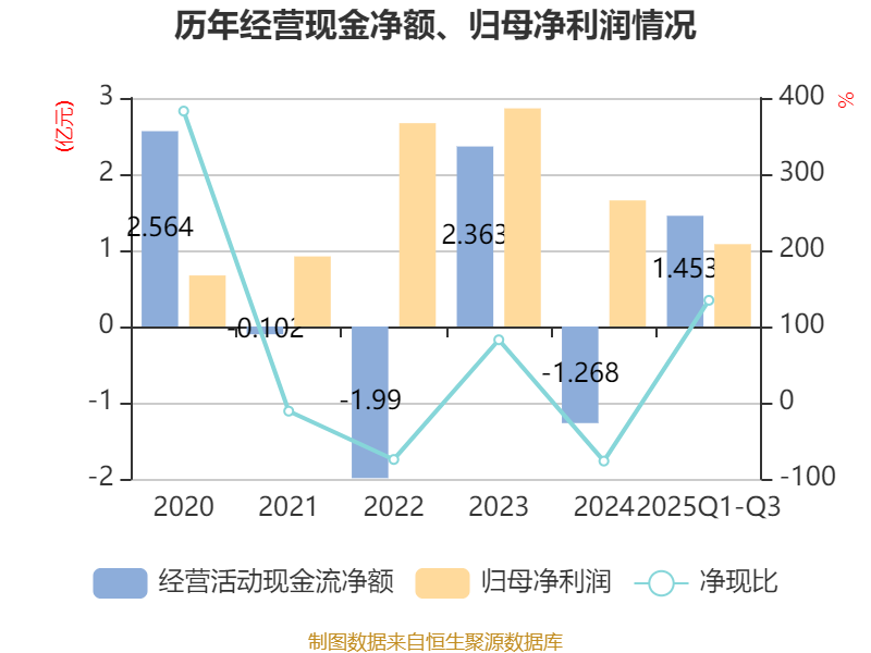 2025年前三季度,公司经营活动现金流净额为1.45亿元,同比增加4.77亿元;筹资活动现金流净额1.19亿元,同比减少3.13亿元;投资活动现金流净额-4.06亿元,上年同期为-4.34亿元。