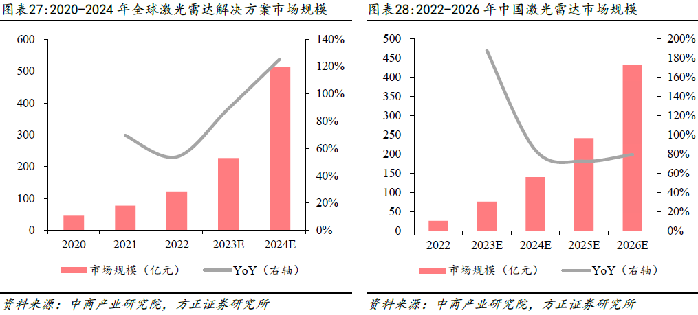 激光雷达是自动驾驶系统中一项关键技术,近年全球智能网联汽车产业进入加速发展新阶段,推动着激光雷达市场规模高速增长。2022年全球激光雷达解决方案市场规模为 120 亿元,根据中商产业研究院预测,2023 年全球激光雷达解决方案市场规模将达到 227 亿元,2024 增至 512 亿元。国内方面,随着智能化技术的持续突破和升级,受无人驾驶车队规模扩张、高级辅助驾驶中激光雷达应用渗透率提升、以及机器人及智慧城市建设等领域需求的推动,国内激光雷达市场驶入快车道,2022年市场规模约26.4亿元,预计2026年可增至139.6亿元。